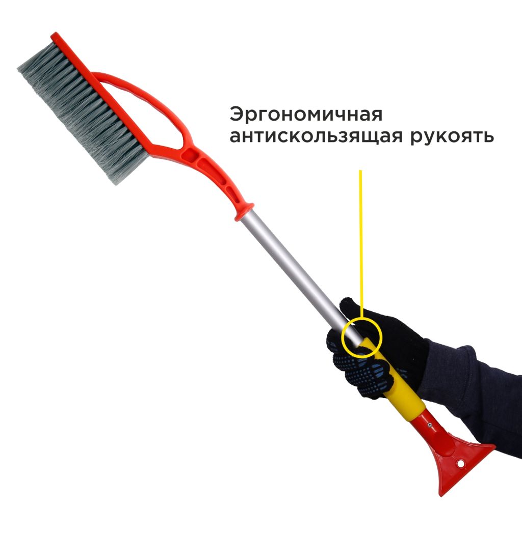 Мягкая распушенная щетина обеспечит деликатную очистку без вреда для кузова и стекол авто. Прочный скребок легко уберет лед.