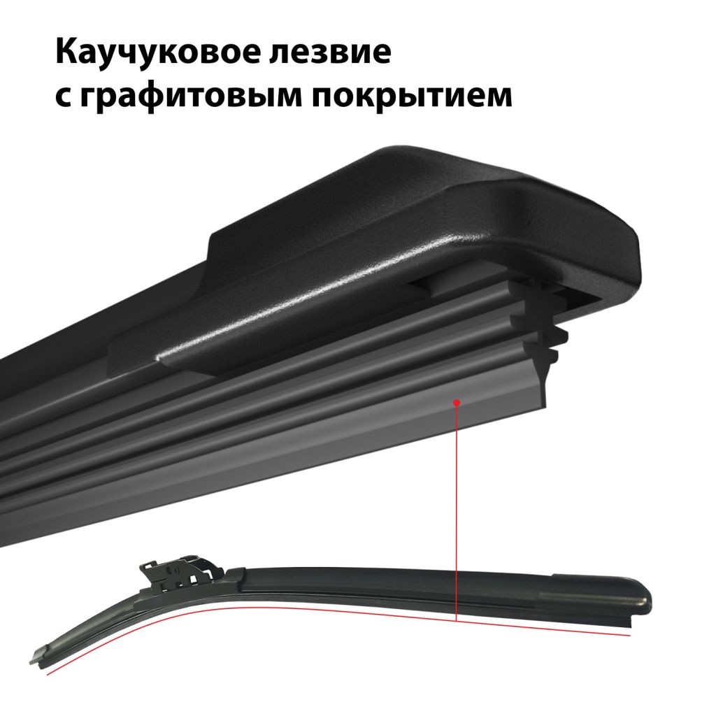 Симметричный аэродинамический спойлер обеспечивает идеальное прилегание лезвия к стеклу и качественную очистку на высокой скорости.